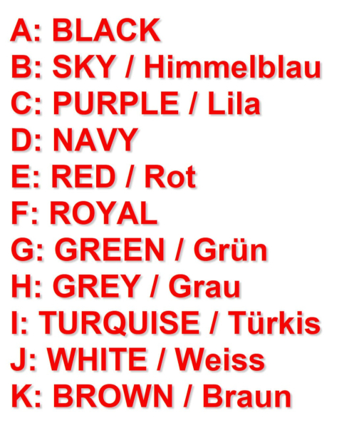 | Kleur | Zwart, Hemelblauw, Lila, Navy Blauw, Rood, Royaal Blauw, Groen, Grijs, Turquoise, Bruin, Wit |
